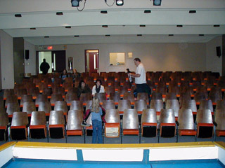 La salle (pas pendant un match ici) était intime et propice à la bonne acoustique. On apperçoit Michel Hédou et sa fille en train de tout préparer. |