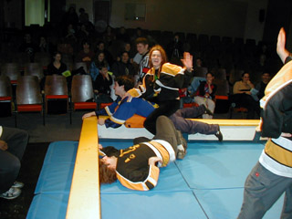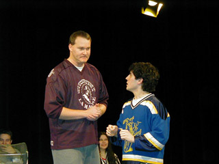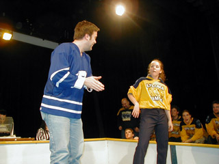 John Boucher de la Ligue d'Improvisation Acadienne se fait "donner une drive" par Annick Landry de l'équipe de l'UMCE. |