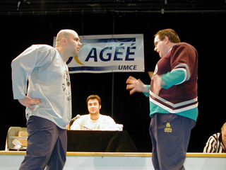Les gens vont au Richard Therrien Open pour voir les grands de l'impro jouer... Ou les gros, selon le cas. Rencontre ici entre Michael "Bauble" Plourde de la LIMA et Alexandre "Bébert" Hébert de la LISA (L.I. Sans Affiliation). |