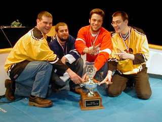 Les gagnants pour la seconde coupe consécutive: la Ligue d'Improvisation Acadienne, avec Yves Doucet, Puce Carrier, John Boucher et Michel Albert (pis 2 chandails vides). |