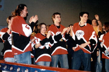 La marraines étaient toujours là pour boire à la santé de leurs équipes (Patrick Hardy et Marc Lamontagne en jaune). |