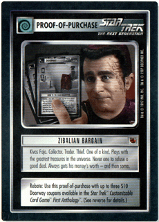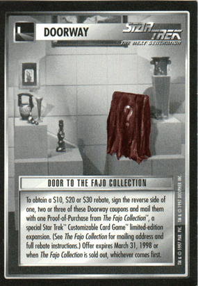 USABILITY: Obviously, I haven't sent mine in. Well, it says the offer's good 'til when the Fajo Collection is sold out! Unfortunately, the actual proof-of-purchase only states 31/03/98 as the cut-off date. Sure, Decipher has extended the period, but with the 1st Anthology quite probably sold out by now, I don't expect them to honor the coupon forever. [In fact, it is no longer valid.] Also, while a 30$ rebate on the Fajo Collection is quite good, you'd have had to buy 3 Anthologies to get that much! Sure, it's like buying booster packs in bulk, but some of us have complete or near-complete collections that don't require a new load of duplicate rares, much less commons. And most of the preview cards are unique personnel that can't really be used in multiples. I guess I was too lazy to make the effort of sending the paperwork just to get a 10$ rebate. Still, I expect most people did get their refunds. A 2.5 (for when it was valid).