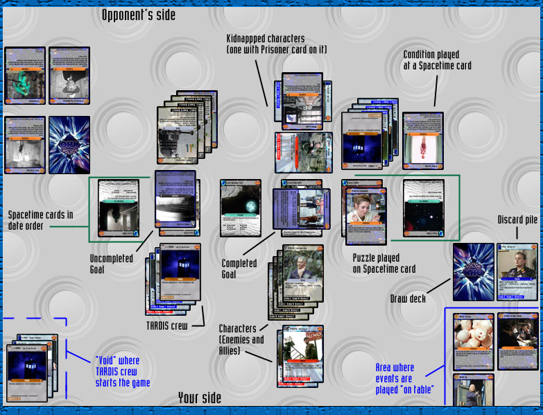 This is a collectible card game for 2 or more players, set in the Dr. Who universe. Being a CCG, each player may build his or her deck any way they wish, with whatever cards they want (or can), as long as there are no more than 4 copies of any one card (including those played during Set-Up). No two decks will be the same, so no two games will be the same. In the spirit of Who, the villains (Enemies) attempt to reach Goals played on Spacetime cards to score points. Meanwhile, the Doctor and his Allies try to stop them and score those points first. Each player plays both his own TARDIS crew and the Enemies their opponent’s TARDIS will face. First player to 10 points (and both Reaching and Opposing at least one Goal) wins.