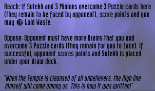 -Overcoming: Some cards need to be overcome. In such cases, they will have requirements (just like Goals). If these are met, the card is overcome and destroyed. You may only attempt to overcome a Puzzle card if you are attempting to Reach or Oppose a Goal, or attempting to score points from a Purpose card.