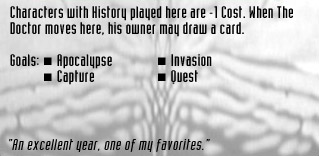 In italics is a quote from the episode. Most cards follow this pattern, with the few exceptions explained below. Note that there is no real mechanical difference between Gallifrey and non-Gallifrey Spacetime cards, even though there is an aesthetic difference. When a card plays "on Gallifrey", it may play on any Gallifrey Spacetime card.
